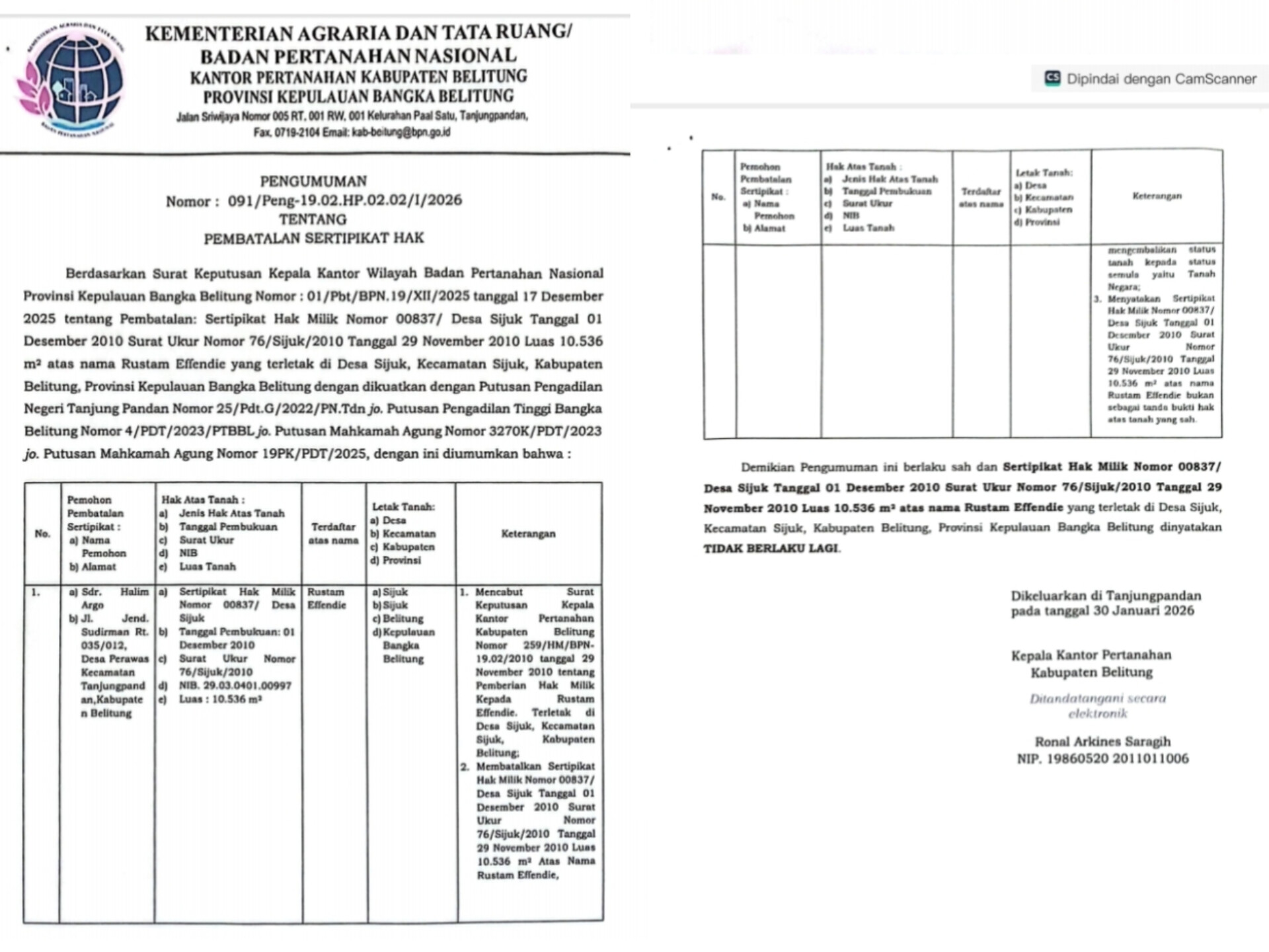 BPN Belitung Umumkan Pembatalan Sertipikat Hak Milik atas Nama Rustam Effendie di Desa Sijuk